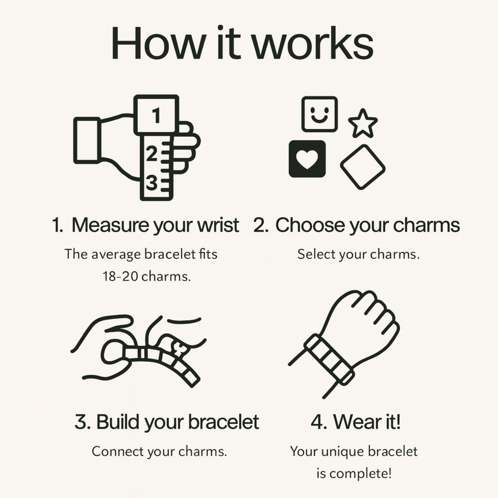 SIZING | We recommend having a total of 18 to 24 charms so that you can adjust the sizing to your preference by simply adding or removing charms. Our starter bracelets come complete with 18 charms.